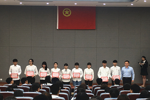 在团旗的见证下,张传德为新团员代表佩戴团徽,并为获得院级五四团内表彰的团员代表颁奖。薛枫宣读了《关于表彰2019年财经学院团内优秀个人的决定》。