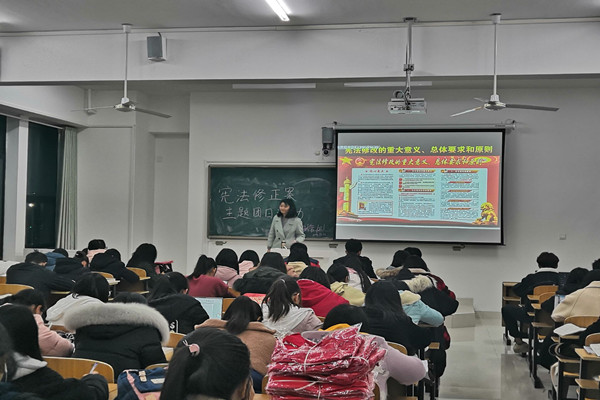 主题团日活动中,学院专、兼、挂职团干深入到所联系团支部,全程参与支部团日活动的开展。分团委团干在团支部指导活动时指出,实现中华民族的伟大复兴离不开法治保障,离不开依法治国这个党领导人民治理国家的基本方略,对宪法修正案不能孤立地学,而要在“结合学习”上下功夫,要结合党的十九大精神,结合党的十八大以来党中央提出的一系列理论创新、制度创新和实践创新,结合习近平法治思想特别是宪法思想来学习。活动中,各班级充分发挥主观能动性,采取了PPT课件展示、观看相关影视作品、讨论、知识讲解等多种学习形式,切实做到了学习人员、学习内容、学习时间、学习效果的四落实,掀起广大团员“学宪法、讲宪法”的学习热潮,取得了应有的效果。