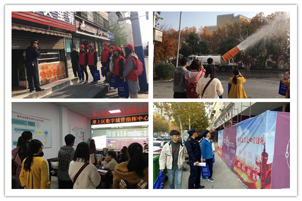 此次活动共分5组,同学们在蚌埠市城市管理行政执法局各区执法队队员的带领下,分别到高新区、淮上区、禹会区、蚌山区、龙子湖区的重要路段,参与了劝导纠正占道经营、出店经营、清理乱堆乱放、规范非机动车停放秩序等不文明现象。执法人员带领同学们了解环保装备,现场展示清扫、洒水、雾炮车等环卫机械作业。同学们还参观了数字化城管指挥中心,感受数字城管信息系统的运行模式、案件派发、处置过程。活动中,同学们向城市居民发放《居住地市容环境群众满意度测评表》,进行问卷调查。
