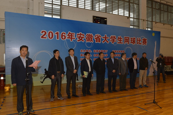 安徽省委教育工委副书记王佩刚、合肥工业大学副校长吴玉程、合肥学院副院长郑永红、安徽省教育厅体卫艺处处长宣进、本次比赛裁判长殷剑巍(国际网球铜牌裁判)及各高校体育部负责人等出席开幕式并观看首场比赛。