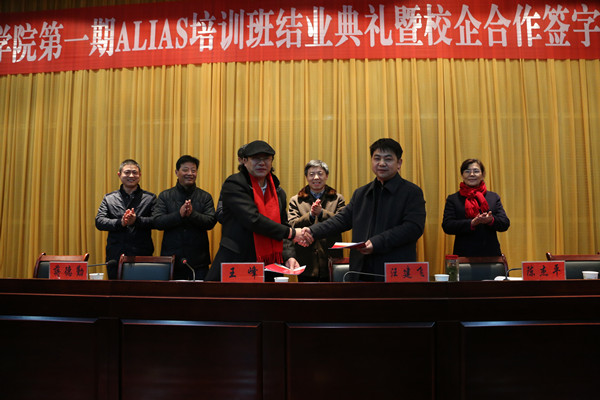 12月25日下午,ALIAS第一期培训班结业典礼暨校企合作产学研教育基地签字仪式在会议中心二楼报告厅举行。校党委书记蒋德勤、副校长汪建飞,蚌埠市人社局副局长张坦,蚌埠市原科技局局长郭长友,安徽后青春工业设计研究院院长王峰等领导和来宾出席签字仪式。