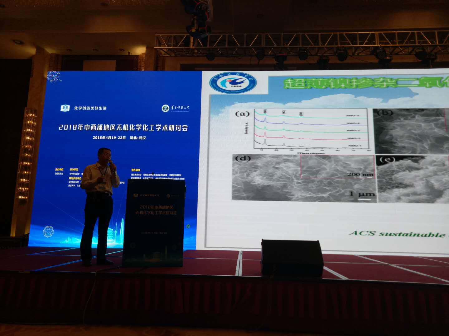 由中国化学会、华中师范大学、华中科技大学、武汉大学联合主办的2018年中西部地区无机化学化工学术研讨会于4月20日至22日在武汉市洪山宾馆举行。会议由北京大学高松院士和南京大学孙为银教授任会议主席,主题为“化学创造美好生活”。深圳大学倪嘉缵院士、中国科学院化学所李玉良院士、中山大学计亮年院士、复旦大学赵东元院士、中山大学陈小明院士、国家自然科学基金委陈荣教授、南京大学孙为银教授等国内外著名院校的500余名专家和学者参加了会议。
