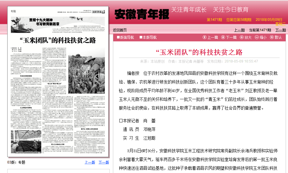 5月9日,《安徽青年报》3版以“‘玉米团队’的科技扶贫之路”为题,整个版面专题报道了我校玉米科技创新团队致力科技扶贫的先进事迹,具体链接如下: