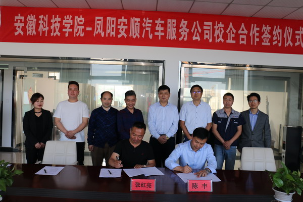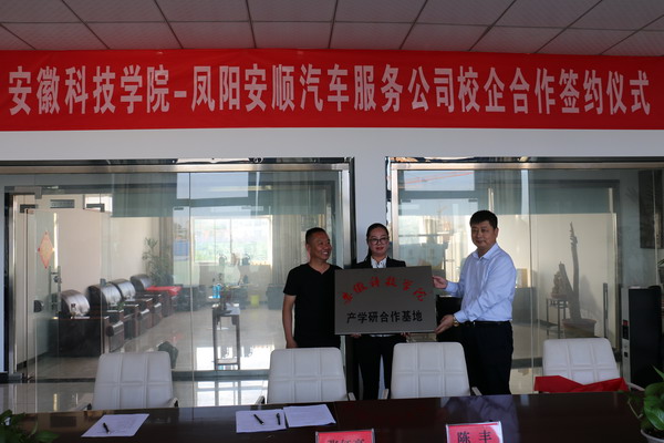 安徽科技学院机械工程学院与凤阳县安顺汽贸有限公司签署了关于汽车后市场人才培养的产学研协议,并举行了安徽科技学院产学研合作基地的揭牌仪式。(特约通讯员:乔印虎)