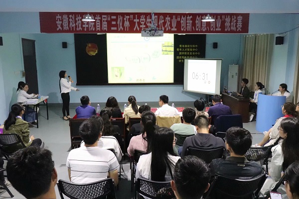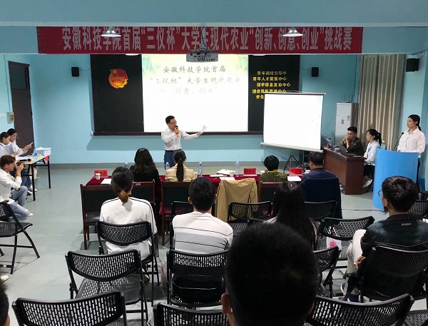 5月26日下午,安徽科技学院首届“三仪杯”大学生现代农业“创新、创意、创业”挑战赛在校医院二楼青年媒体运维中心举办。比赛邀请了生命与健康科学学院党总支秘书彭丽萍、学生处学生资助中心主任黄钦海、信息与网络工程学院党总支秘书,团委书记杨晓宁、学生处学生科科长石志成、动物科学学院辅导员贾方敏担任评委,农学院党总支副书记沈树周、农学院辅导员郑玉莲出席比赛现场。比赛由金禾创新创业中心项目部赵梓薇主持。