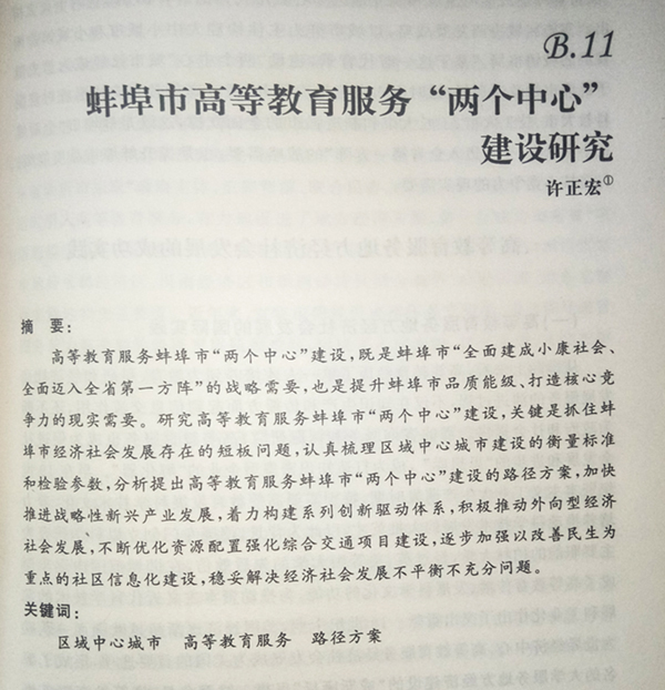 许正宏在专题报告里提出高等教育服务蚌埠市提升综合经济能力,核心是推进战略性新兴产业发展;高等教育服务蚌埠市提升科技创新能力,关键是构建系列创新驱动体系;高等教育服务蚌埠市提升辐射带动能力,要务是推动外向型经济社会发展;高等教育服务蚌埠市提升交通通达能力,重点是优化资源配置强化综合交通项目建设;高等教育服务蚌埠市提升信息交流能力,前提是以改善民生为重点加快推进社区信息化建设;高等教育服务蚌埠市提升可持续发展能力,条件是解决发展不平衡不充分问题。该报告以问题意识为导向,分析形势透彻,提出建议合理,一次性通过《蚌埠蓝皮书编委会》审核。