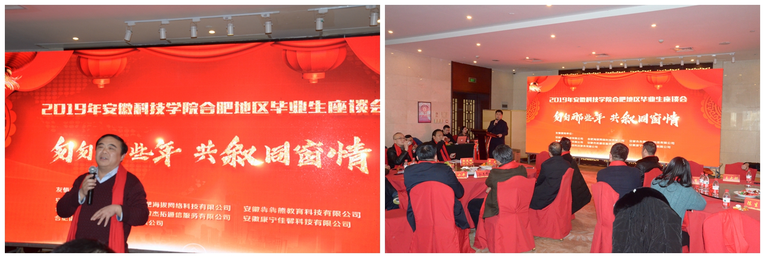 1月26日, 2019年安徽科技学院合肥地区毕业生代表座谈会在翡翠湖迎宾馆成功举办。党副书记韦文联,党委委员、副校长郭亮等应邀出席并讲话,座谈会由2002级资源与环境专业王宁、2005级计算机科学与技术专业杨森主持,合肥地区各届毕业生代表80余人参加会议。