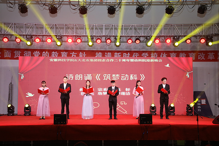 二十年初心不忘、新时代再创辉煌。11月10日晚,我校与大北农集团校企合作20周年庆典暨动物科学学院迎新晚会在校西区体育馆内隆重举行。校党委副书记、校长李震,校党委委员、纪委书记王强,校党委委员、党委(校长)办公室主任曾献功,大北农集团中央研究院副院长王丹玉、安徽区总经理王振凯,动物科学学院党总支书记汪洋,校职能部门负责同志等出席庆典,并与动物科学学院校友代表和师生共800余人共同观看了晚会。