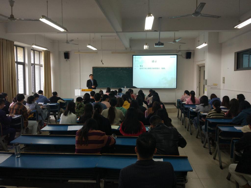 姚大怀本次教学的主题为“应用文写作-请示文体讲解”。示范课上,他围绕“请示”这一应用文体,从概念、特点、种类以及结构四个方面出发,逐层递进,深挖教材,以娴熟的教学技巧、丰富的教学经验带领着学生们深入课堂,积极参与教学。他将理论知识与实际案例相结合,将现学知识与以往知识相贯通,教学思路清楚,方法恰当,容量适度,使教学内容直观地呈现在学生面前,并帮助学生在课堂上构建出了一个属于自己的学习框架。在引入本节课重点内容“请示文体”时,姚大怀多次将已教学过的多类文体与请示进行对比,引导学生积极思考,从而清晰地交代了请示的概念特征及结构。姚大怀简洁利落又不失风趣幽默的语言极大调动了学生的学习兴趣,促使学生在轻松愉快的课堂氛围里较为顺利地掌握了所学内容。