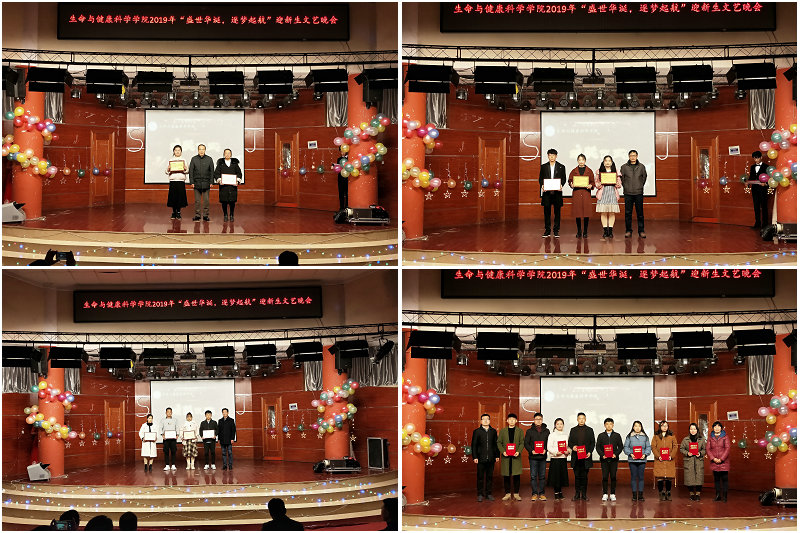 为表彰先进,给2019级新生树立榜样,在晚会正式开始前,还举行了简短的颁奖仪式,学院领导老师为生命与健康科学学院庆祝新中国成立七十周年歌咏比赛获奖班级和生命与健康科学学院2019年“十佳大学生”颁发奖牌奖状。(特约通讯员:王传林 摄影:万尚文 袁美)