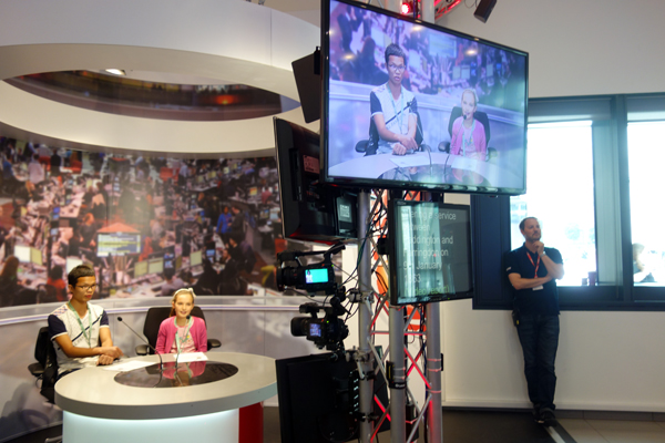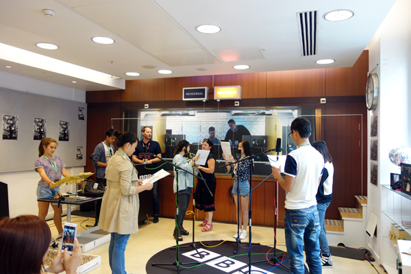 下午Kaplan的工作人员带领学员们去参观了英国广播公司(British Broadcasting Corporation),即闻名遐迩的BBC。作为英国最大的新闻广播机构,也是世界最大的新闻广播机构之一。 BBC特意安排了导游带大家去参观了公司的工作场所。透过宽敞明亮的橱窗玻璃,学员们能清晰地看到里面的工作状态,每个人面前都会有两到三台电脑,每个工作人员都在里面认真地工作,并没有因为游客的到来而受到干扰。接着,导游带领大家去参观了新闻演播室,演播室的工作人员随机从游客中挑选了两个人来扮演主播的角色,让大家亲自尝试主播工作,更加直接地了解新闻制作与录制的过程。赴英游学营的徐超超同学有幸被选中当了回男主播,用英语播报了两条新闻,其表现得到了在场人员的肯定, 随后学员们参观了一个访谈节目的演播厅。这个演播厅接待过很多英国的著名人物,许多同学在演播厅里拍照留念。在相邻的一个直播间里,BBC的导游专门为游客们提供了一次亲身体验为英国戏剧配音的机会,游学营中的五名同学和英国的一位小朋友一起上前扮演了六个不同的角色,BBC的工作人员当场给他们的配音录了下来,搭上一些道具的声音,经过一些人工处理后,播放出来给大家听,听起来感觉真是一个生动的故事,仿佛让大家已经身临其境。