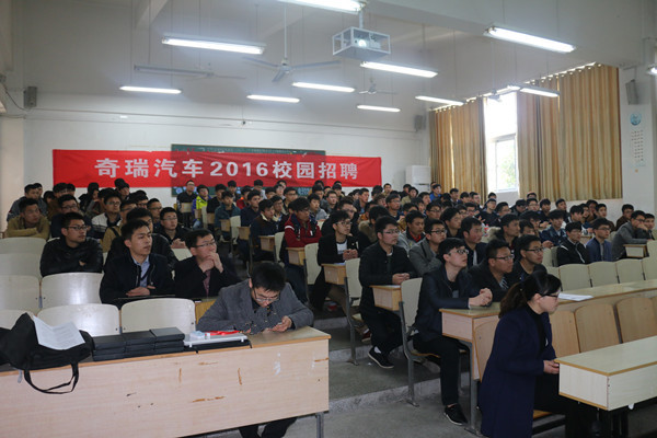 3月16日下午,奇瑞汽车股份有限公司在求知楼A107教室开展企业宣讲,招聘人才。校招生就业处处长黄树桥、机械工程学院院长陈杰平、党总支副书记路云接待了公司人事部领导一行。2012级车辆工程、汽车服务工程、机械自动化、计算机科学技术、工商管理、电信工程专业100余名毕业生参加了企业宣讲会。
