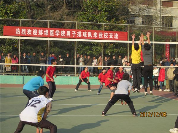 12月8日下午,在主教练崔杰的带领下,蚌埠医学院校男子排球队应邀来我校交流,比赛在我校东区排球场进行。此次比赛为校际间交流,吸引了众多的排球爱好者前来观看。我校体育教学部教师李颖老师担任主裁判。