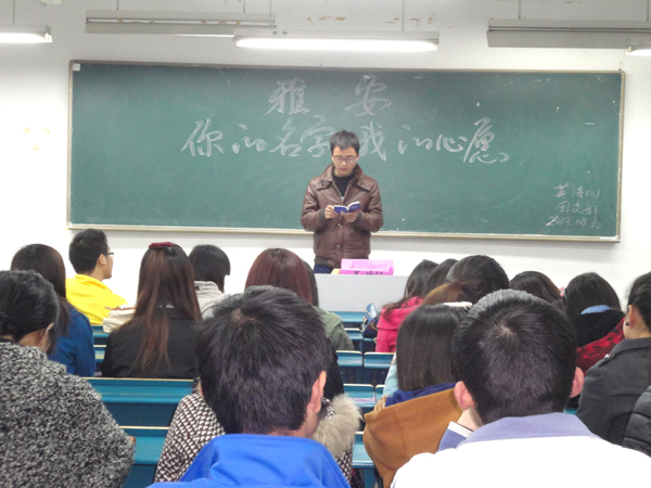 在校团委组织开展“安科学子,情系雅安”活动之际,4月22日下午,英语101班在求知楼B107举行了以“雅安,你的名字,我的心愿”为主题的捐款捐物活动。活动由班级宣传委员主持,全体同学参加。