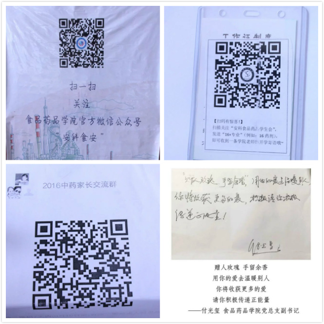 “新生扫码获老师寄语”——为了带给新生如家般的温暖,消除其初来乍到的陌生感。食品药品学院学生会官方微信平台推出了“扫码获老师寄语”活动,新生们可以通过扫描二维码关注公众号并输入关键字,如“16食安”,即可获得学院领导老师亲手写给新生的真诚寄语,一字一句都体现出老师对新生的期许与厚望。