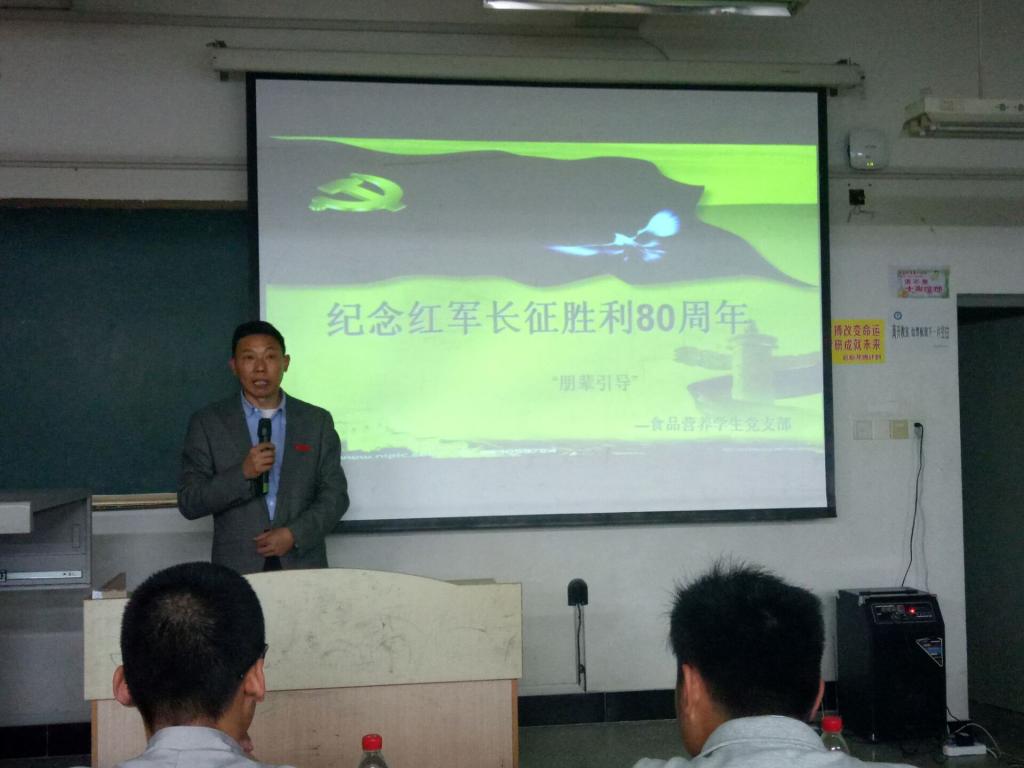 比赛开始前,开金苗作了讲话,他对举办此次活动的意义表示肯定,他要求食品学生党支部要借此主题教育活动为契机,在2016级新生中进一步发挥“朋辈引导”作用,深入推进“两学一做”;他还要求同学们以学院在2016级新生中开展的“立规矩、树形象、正风气”专项整治活动为契机,争做守规矩,传递正能量的模范,展现当代大学生风采;并号召同学们努力学习,在新的长征路上继续奋勇前进,为实现“两个一百年”的奋斗目标,实现中华民族伟大复兴的中国梦奉献青春力量。