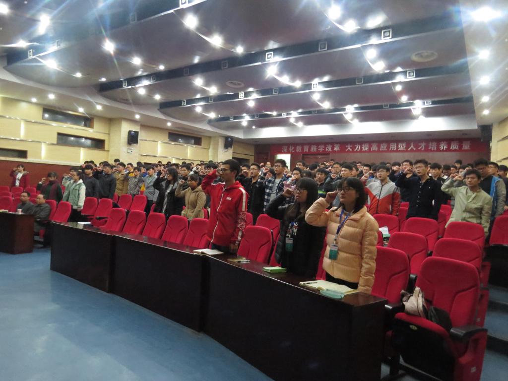 最后,全体参与成员起立共同宣誓,气势磅礴,震撼人心,把会议的气氛推向高潮。尚磊在会议总结中表示:期望当代大学生坚持以诚待人,以诚做事,人生之路才会走得更远。