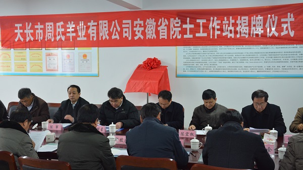 2015年12月23日上午,安徽省天长市周氏羊业院士工作站揭牌仪式在天长市大通镇周氏羊业有限公司举行。中国农科院北京畜牧兽医研究所储明星研究员、安徽农业大学陈宏权教授、安徽科技学院王立克教授、安徽省农科院畜牧兽医研究所朱德建副研究员、滁州市科技局刘大庆副局长、滁州市疫控中心郑守智主任和天长市市委常委、副市长陈军以及天长市科技局、农委、发改委、财政局等单位领导出席了此次揭牌仪式。大通镇党委书记叶晓东主持了揭牌仪式。