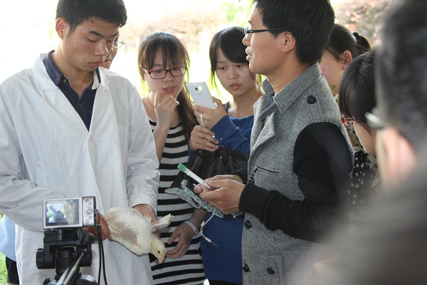 培训中,贺绍君向大家介绍了如何给鸡采血以及各器官的摘取,并告诉大家在操作过程中所需要注意的细节问题,特别是在器官摘取过程中,贺老师每取出一个器官就向同学们解说其的作用及摘取的方法。贺老师以其丰富的临床经验,深厚的专业技能为现场的同学们上了生动的一课。