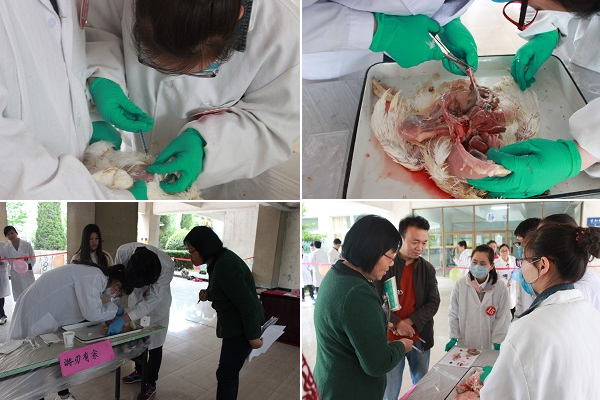 在疫苗注射环节,选手们认真观察,仔细思考进针部位和方向,熟练的操作手法,合理地分工,让第一环节比赛顺利完成;第二环节的鸡翅下静脉采血,参赛选手们一丝不苟,仔细的选取下针部位并消毒,选手们持针手法准确,采血过程顺利;在心脏采血环节,要求选手们在规定时间内,准确找到位置并下针,有的队伍一针见血,有的队伍在尝试了几次之后,也顺利采到鸡心血;最后一个环节为解剖及病理分析,选手们合力分工,通力配合,操作流畅,技巧娴熟,不到二十分钟,参赛选手都纷纷完整地分离出鸡的心脏、胰脏、法氏囊、肾脏等器官。在评委老师提问的过程中,选手们熟练地回答出评委的各个专业问题,经过一个多小时的紧张角逐,比赛接近尾声。结合初赛和复赛的成绩,最终“学霸队”和“树懒队”获得一等奖。