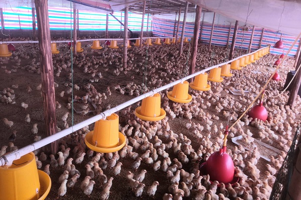 在和该场主刘先生一番交谈后,刘先生带领我们参观了他家的养鸡场,在刘先生的带领下,我们了解到该养殖场主要有三间房舍,一间育肥舍和一间产房,还有一间育仔房,鸡的品种主要为三黄鸡。同时刘先生告诉我们,最近猪瘟横行,育肥鸡供不应求,所以销售很快,据刘先生介绍,目前育仔鸡有800多只,基本上都是9天龄,出栏大概要在一百天后左右,较符合该品种的养殖周期。参观完鸡舍,我们在与交刘先生交谈中得知,刘先生的养殖场主要利用三格化粪池对粪便污水进行处理,化粪池中的污泥经过晾晒后用作肥料撒在自家地里,如西瓜地,玉米地等等,实现还田利用。同时我们也向刘先生介绍异位发酵床技术,介绍了该技术的利弊,也得到了刘先生的大力支持。