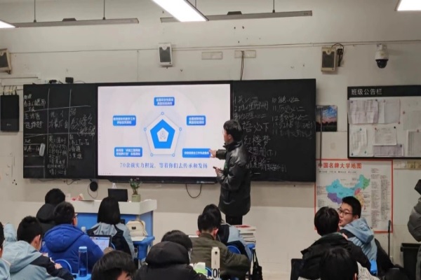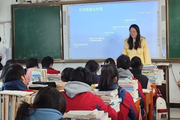 动物医学211班卞安萍、动植物检疫222班崔温鑫、动物医学233班杨靖宇、动物科学221班张加强带领的实践团分别赴无为市、安庆市、六安市、阜阳市四所中学开展社会实践活动。实践团成员拜访了班主任及任课老师,向母校老师汇报了大学生活和学习情况,围绕“教学历史悠久,发展前景广阔”向高二、高三班级宣讲介绍了安徽科技学院的发展成就、优秀校友、师资力量以及有温度的人才培养体系,并就自身升学经历作深入分享。