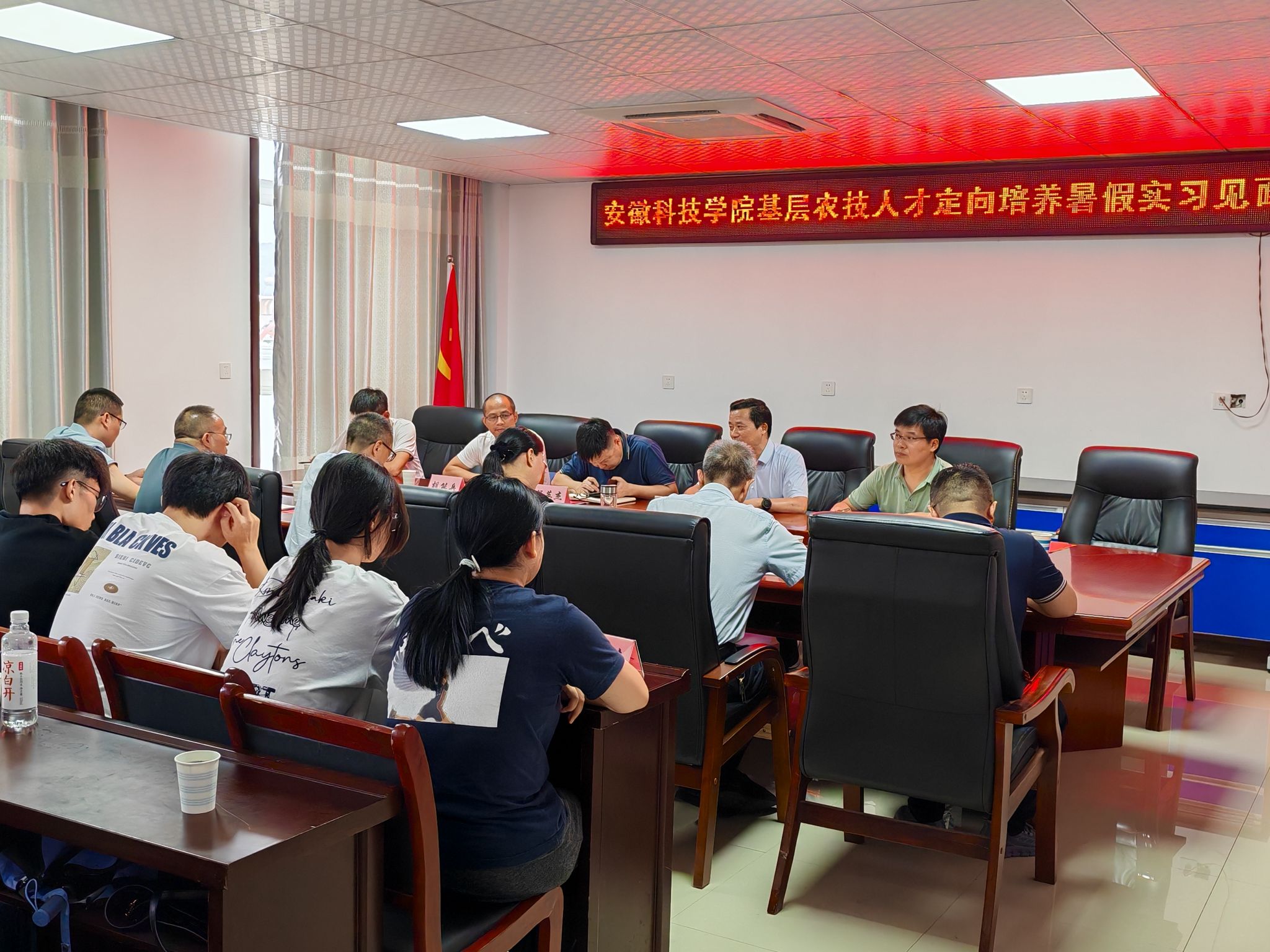 程斌一行分别受到了东至县和太湖县两地农业农村局相关领导的热情接待,并分别与两地农业农村局领导、实习机构相关负责人、校外指导教师、实习学生及部分实习家长进行了座谈。程斌介绍了学校的整体情况,他要求同学们要遵守实习单位的工作纪律,积极主动的参与到各项实习工作中,高质量地完成本次实习任务。贺绍君详细介绍了学院相关情况,以及学院在定向生暑期实习方面所做的安排,包括学生实习方案的制定,实习安排、指导教师职责、实习期间学生管理、实习学生保险购买等。座谈过程中就实习学生及家长关心的问题进行了交流和解答。