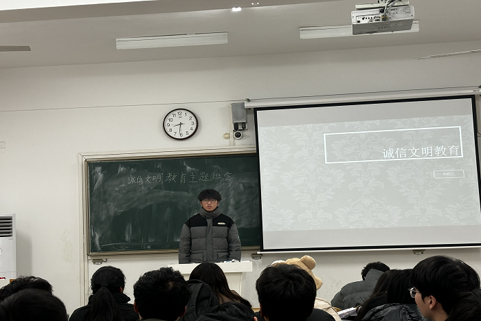 12月28日晚,各班召开主题班会,会议主要围绕“诚信文明教育”展开宣讲讨论。同学们积极上台讲述自己的诚信故事,同时也对身边发生的不文明事件进行交流探讨,将诚信文明意识深入人心。此次主题班会活动结束后,同学们纷纷表示以后要将诚信文明意识落实到自身学习和生活上。