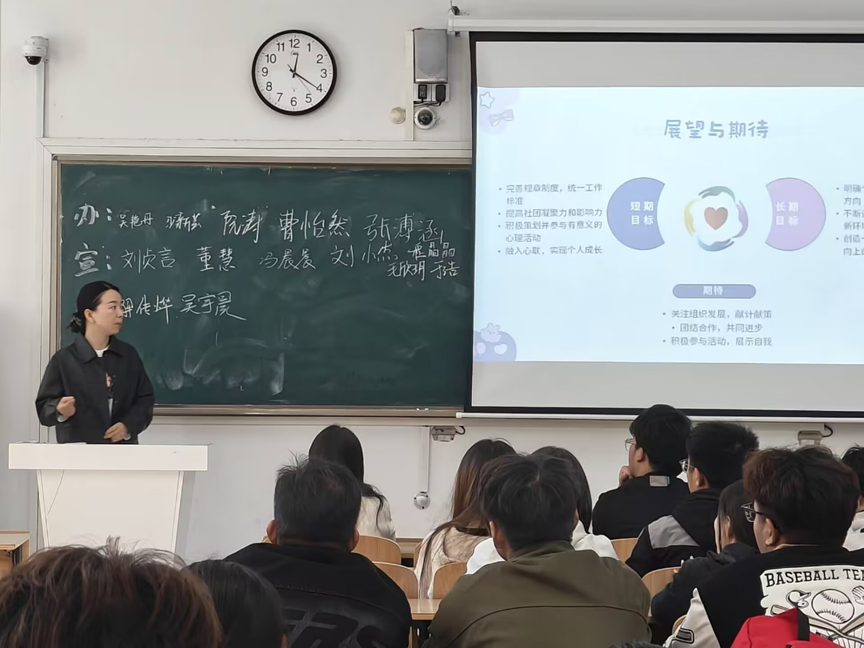 王延丽做了主题发言,并提出了几点希望,一是,希望成员们积极参与各项心理健康宣传教育工作,完成好学院的各项任务。二是,希望心联的各项工作质量不断提升,各项工作规范化,提高工作水平;三是,希望心联各个部门加强合作沟通,集思广益,认真负责地举办好每一次的活动。