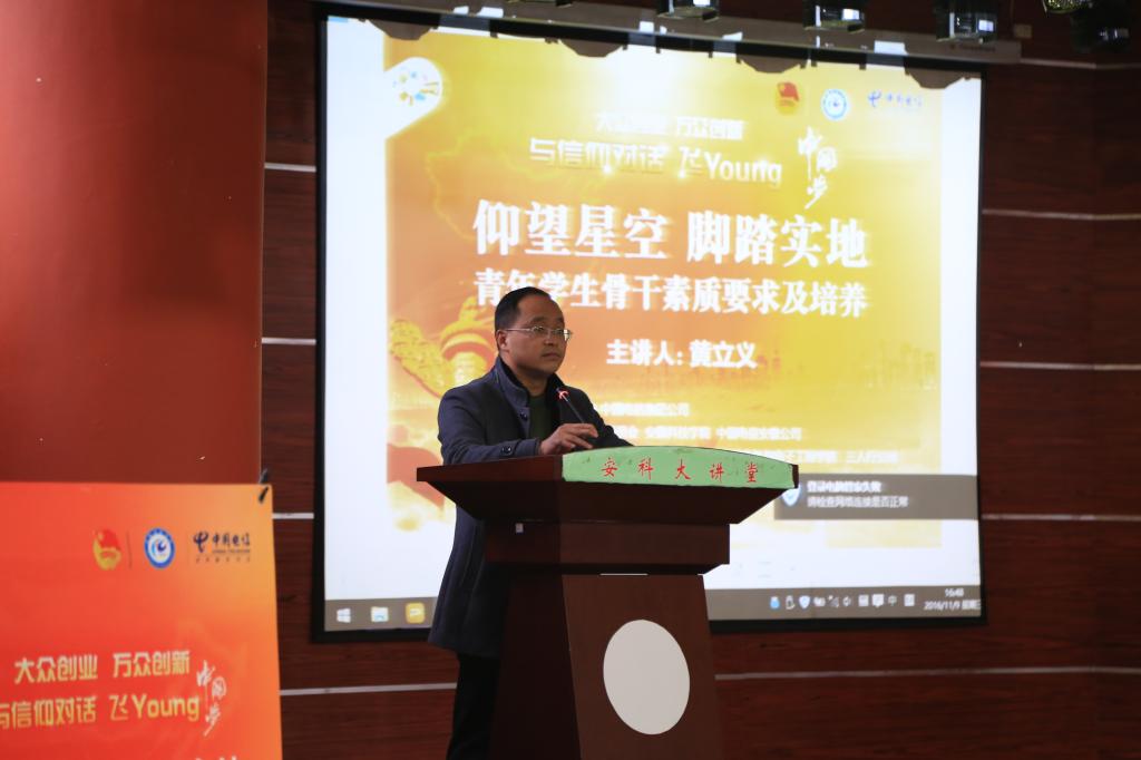 11月9日下午,由共青团中央、中国电信集团公司主办,校团委、中国电信安徽公司共同承办、电气与电子工程学院团委与三人行公司协办的“与信仰对话·飞Young中国梦”专题报告在学术报告厅举办。此次报告也是电气与电子工程学院全体学生干部培训班的首场报告。报告会由校团委副书记黄立义主讲,电气与电子工程学院全体辅导员、全体16级学生干部聆听报告。报告会由电气与电子工程学院党总支副书记尚磊主持。