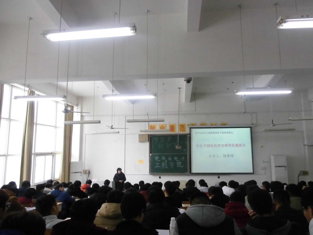为进一步加强学生干部队伍建设,提高学生的工作质量,11月23日下午,电气与电子工程学院在求A102召开学生干部培训会第二场专题讲座,学院党总支秘书、团委书记段素梅担任主讲人,学院16级全体班级干部和学生会全体成员参加了此次培训会。