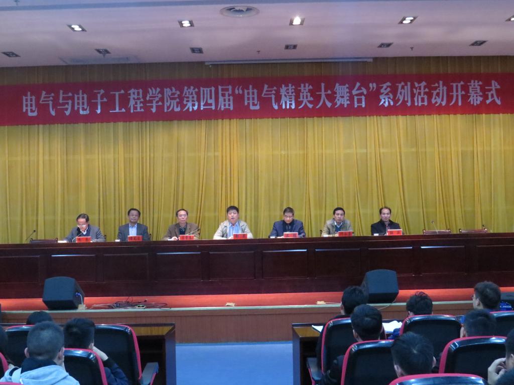 党总支书记张盛致辞。电气精英大舞台”以“缤纷大舞台,共圆成才梦”为主题,适应我校建设高水平应用型大学的需要,积极响应了学校打造校园文化,建设“一院一品”的总体要求。张盛对前三届系列活动进行了回顾和总结,并对即将开幕的第四届“电气精英大舞台”系列活动,提出了具体要求:一要以打造核心竞争力为切入点,三大版块系列活动要紧密围绕专业特色开展;二要在长期和持之以恒中追求建设和发展;三要在寻找比较优势的过程中创新,在学科、专业、人才方面形成自己的比较优势,从而凸显学院特色。