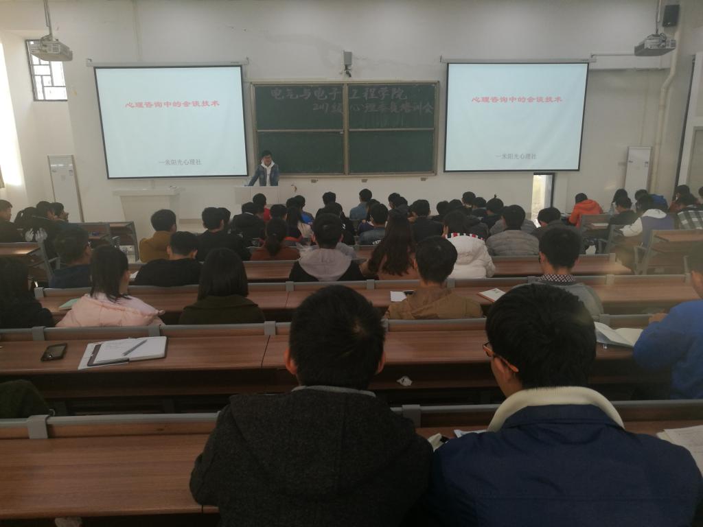 为促进大学生心理健康工作的顺利开展,2017年11月18日下午3:50,电气与电子工程学院一米阳光心理社在龙湖校区致知楼A111开展了2017级心理委员培训。参加培训的人员有:一米阳光心理社前任社长俞强伟,现任社长韩越祥,一米阳光心理社成员,学生会部分成员,学院17级各班心理委员及17级各寝室寝室长。学生会公关部鲁宏主持培训。