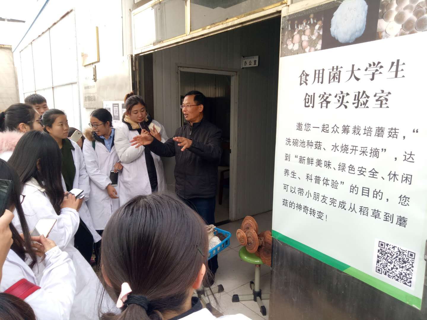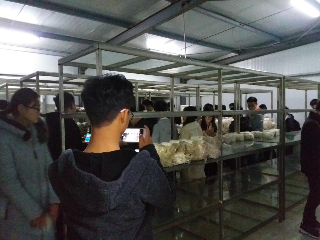 工作室重要成员、食用菌大学生创客实验室负责人何华奇副教授当场为大学生详细介绍了食用菌培养料配制、菌培养料装袋、菌培养料灭毒、菌培养料接种、食用菌培养、出菇管理等蘑菇生产流程,带领同学们参观了香菇、草菇、蘑菇、木耳、猴头、灵芝等食用菌实物展示。