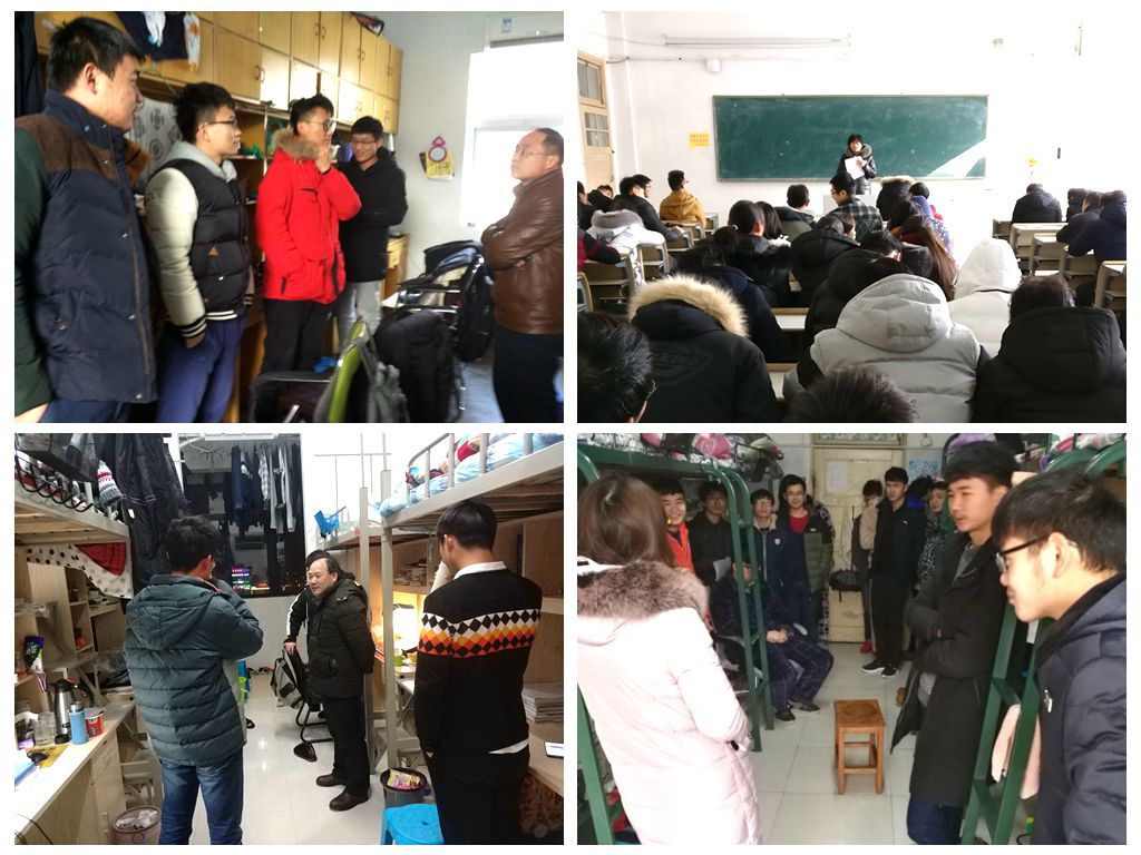 1月5日,学院党总支副书记尚磊传达了学校应对暴雪等恶劣天气学生安全工作会议精神。1月5日至8日期间,学院全体辅导员、班主任深入学生宿舍,排查宿舍安全隐患,检查宿舍卫生状况,了解同学们的学习生活状况。辅导员、班主任将班会搬入了宿舍,对学生表示关心和问候,提醒同学们防寒、防滑、防摔,尽可能不要出校园,注意路上安全,不得违规使用取暖器、电炉等大功率电器。对即将考完返乡的学生,强调交通安全,尽量选择较为安全的出行方式。通过这种新颖的班会形式,给临考学生送去了关心和温暖。