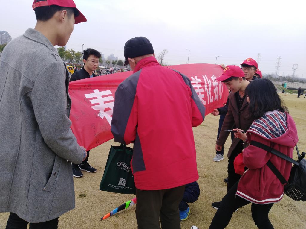 在环保组进行工作的同时,宣传组也拉起了“春游龙子湖,美化亮我心”横幅。宣传组的负责人带领小组人员鼓励游人在横幅上签字,给自己一个承诺,给环境一个承诺,志愿者们还为前来签字的小朋友们赠送了花草小种子,让他们亲身去体会大自然的美好,也为保护地球这个大家园奉献一份力量。