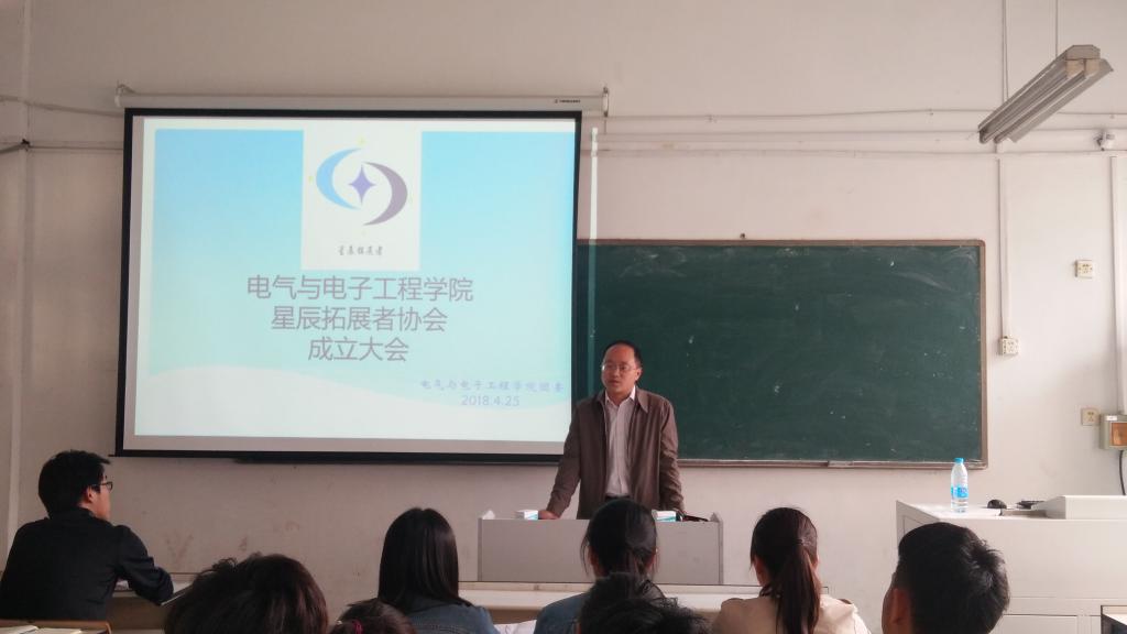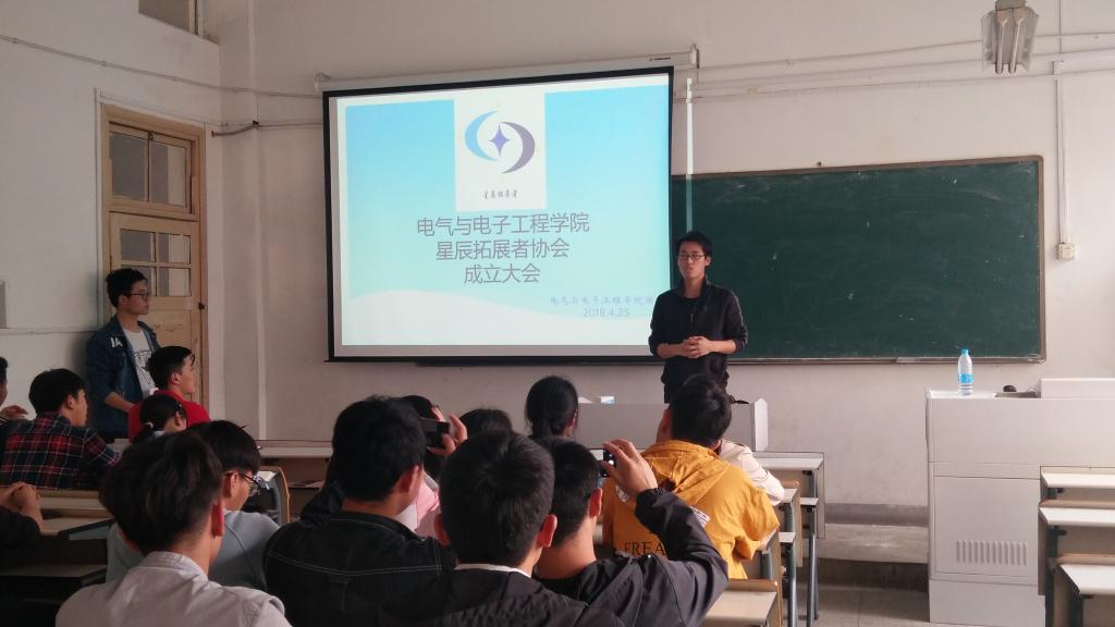 4月25日下午三点,电气与电子工程学院在学知楼114成功举行星辰拓展者协会成立大会。学院党总支副书记尚磊、学生会主席李鹏、学生会各部门部长、各社团代表、星辰拓展者协会会长杨李出席大会,星辰拓展者协会全体成员参加本次大会。成立大会由院社联主席张子玉主持。