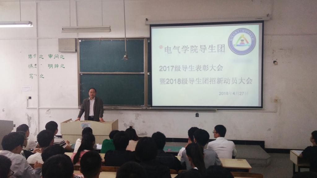4月27日下午,电气与电子工程学院导生团在求A101举行2017级导生表彰大会暨2018级导生团招新动员大会。学院党总支副书记尚磊,党总支秘书、团委书记段素梅,团委副书记王延丽,团委副书记邓茜,院社联主席张子玉,学生会副主席魏兵,学院各社团主要负责人应邀参加了会议,17级导生全体成员参加了会议,会议由导生团副团长徐康良主持。