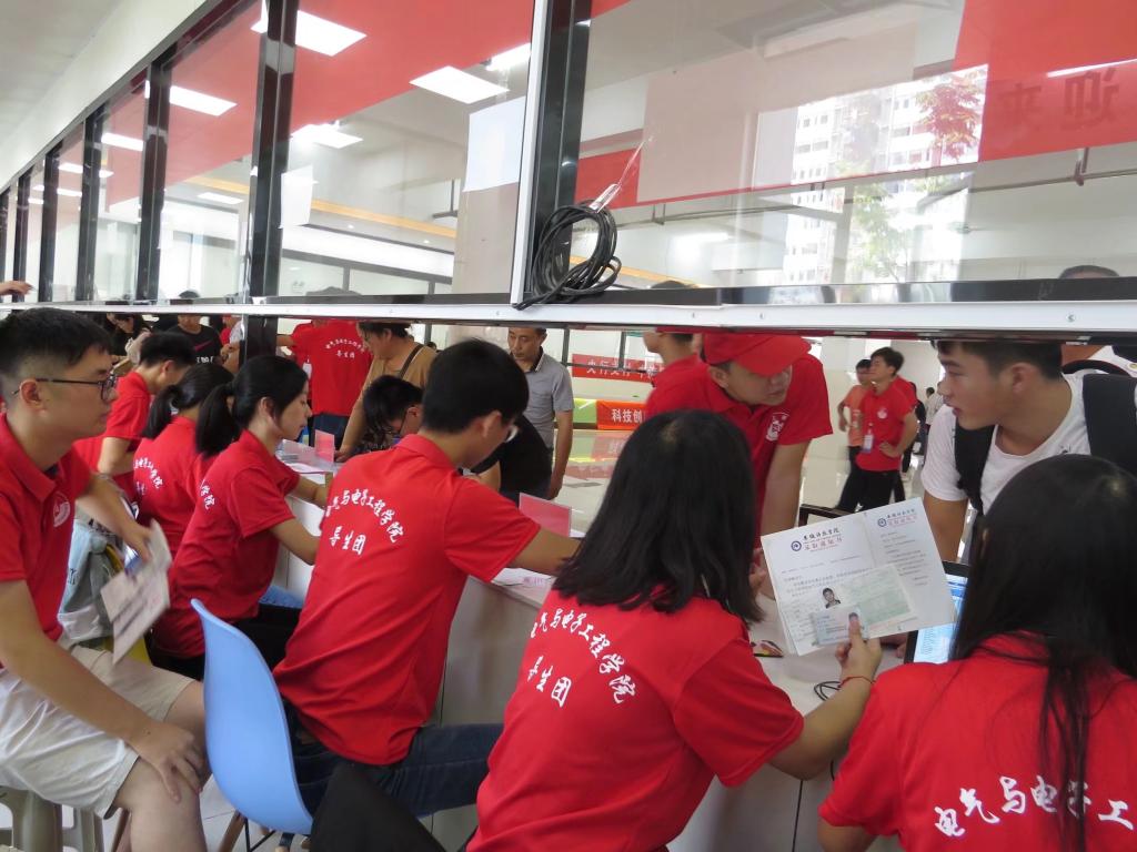 烈日炎炎,阻挡不住新生的求学之路;积极参与,方显学长学姐的工作热情。9月8、9日,是龙湖校区2018级新生入学报到日,校园内人头攒动、场面火爆,停车场停满了各种车辆,部分新生甚至一大早就在家长的陪同下,拎着大包小包的来到了学校。电气与电子工程学院身着红色上衣的迎新工作人员,无疑成为校园里的一道风景线。