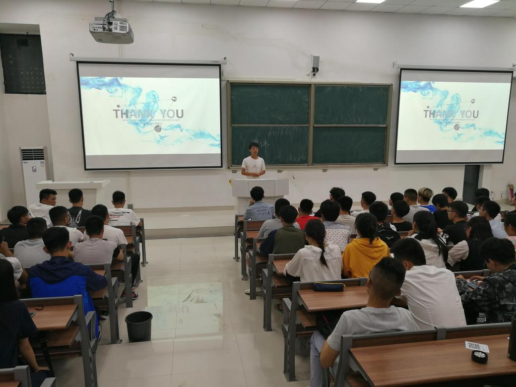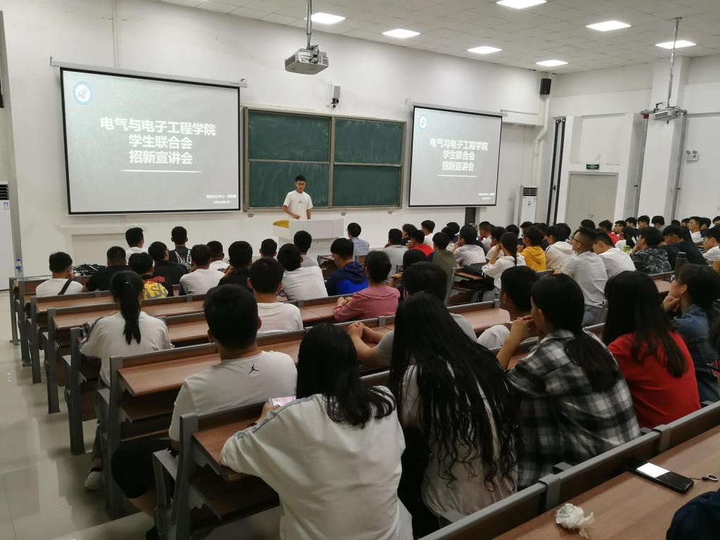 为让2018级新生更好的了解学生联合会及学院社团。9月10日晚,电气与电子工程学院学生联合会于致知楼A111进行中心部门招新宣讲会。出席此次宣讲会的有学生联合会主席兼生活维权中心主任檀伟,宣传推广中心主任胡健,文体发展中心主任黄凯豪,18级全体新生聆听此次宣讲会。会议由黄凯豪主持。