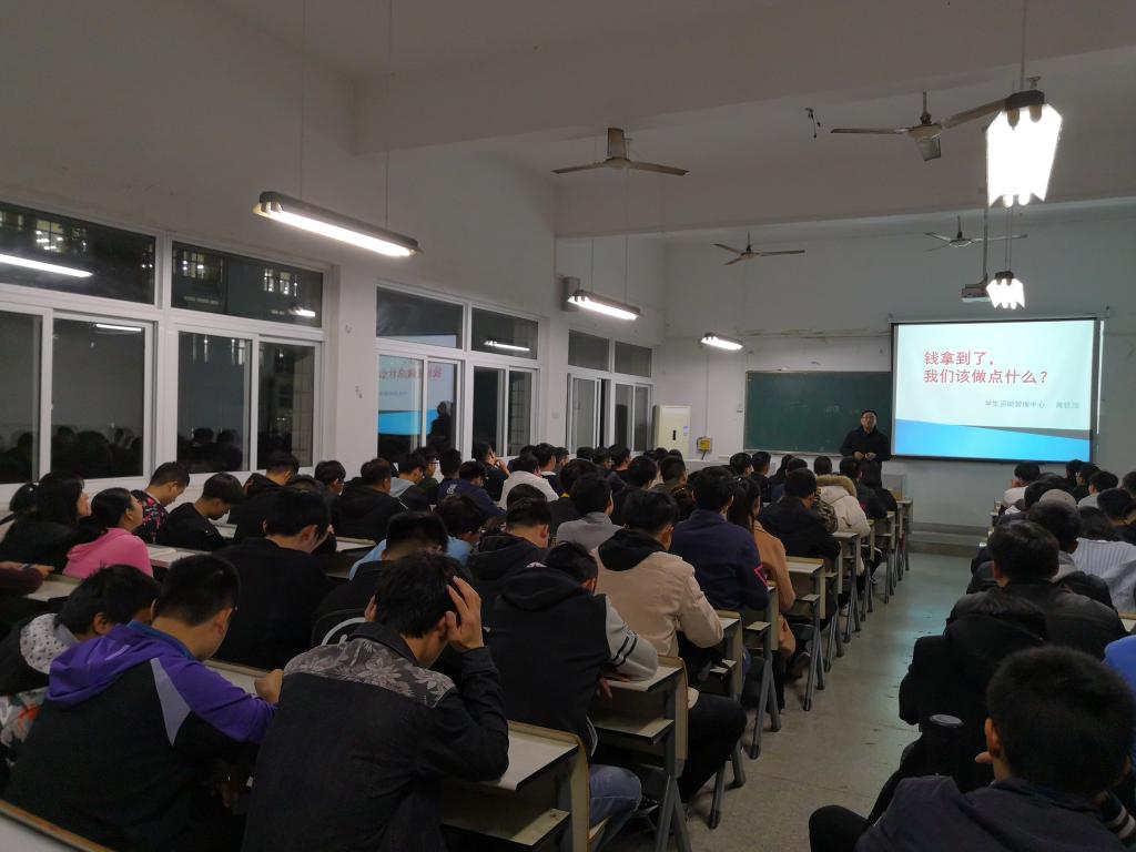 最后,尚磊就奖助学金的合理使用做总结讲话,他先是通过身边学生事迹告诫同学们要自强不息、努力奋斗!接着强调要注意一个问题两个方向。一个问题是:班级内部要正确评判学生贫困生认定问题,两个方向是:一要合理使用奖、助学金,明确使用方向;二是要调整心态、积极进取,明确奋斗方向!