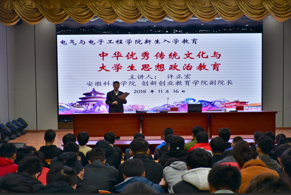 中华优秀传统文化是中华民族的精神命脉,是涵养社会主义核心价值观的重要源泉,具有独特的陶冶情操、浸润思想、涵养心灵、接续人文的重要作用。11月16日下午,电气与电子工程学院在敏行楼A报告厅举办中华优秀传统文化专题教育报告会。此次报告会特邀安徽科技学院创新创业教育学院副院长许正宏主讲,院党总支秘书、团委书记段素梅,辅导员杨勇及学院2018级新生参加报告会。报告会由电气与电子工程学院党总支副书记尚磊主持。