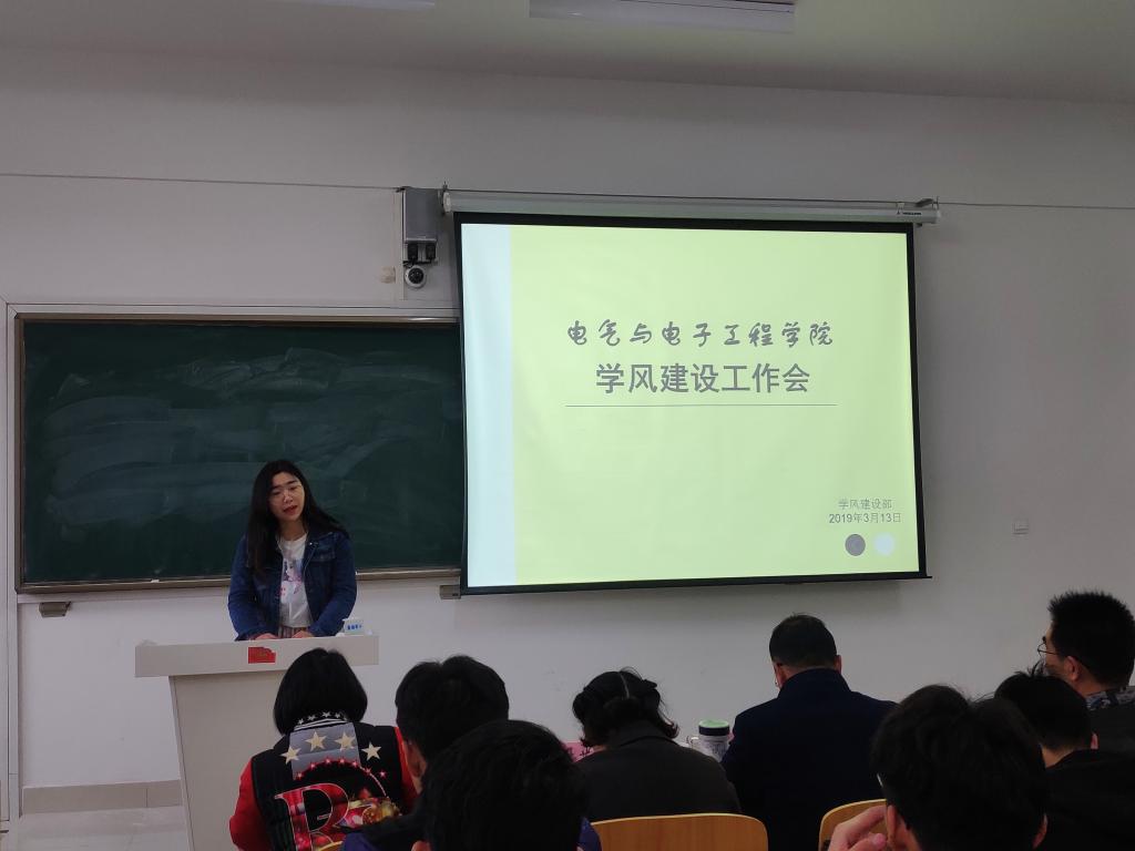 3月13日下午,电气与电子工程学院在致知楼A307召开学风建设工作会,学院党总支副书记尚磊、团委副书记邓茜、辅导员陈更强、辅导员宋志华,以及学院在校班级全体学习委员和学生联合会学风建设部全体成员参加了本次会议。