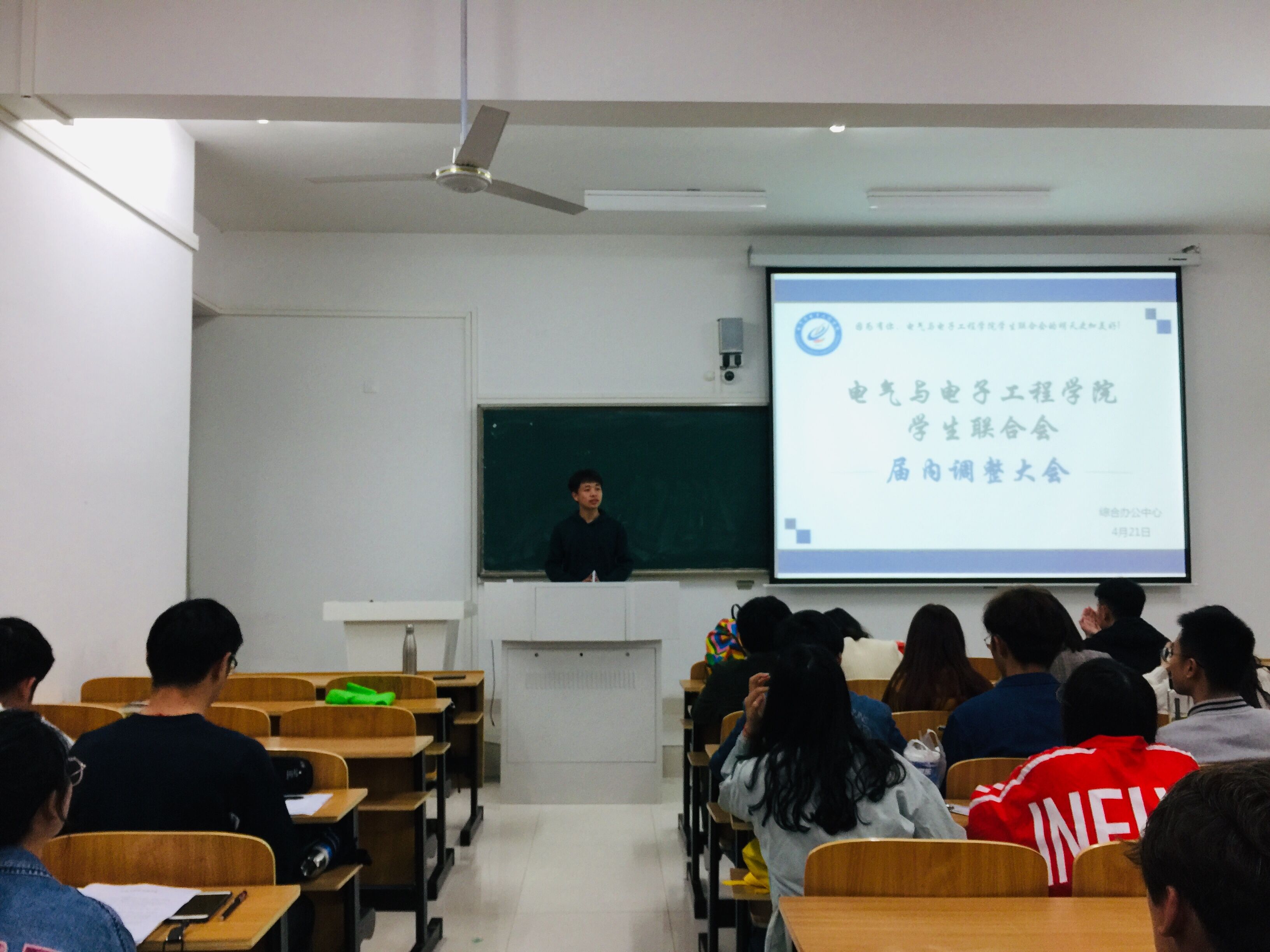 4月22日晚,电气与电子工程学院在致知楼C208教室召开学生联合会届内调整大会。学生联合会指导老师邓茜同主席团及各部门学生干部参加大会。大会由学联主席檀伟主持。