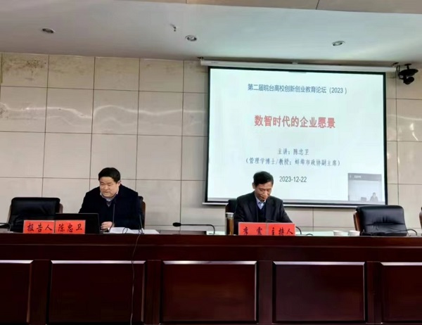 开幕式后,九三学社安徽省委常委、蚌埠市政协副主席陈忠卫,台湾实践大学财务金融系教授黄劲尧分别就数智时代的企业愿景、科技助力高校创业创新展开研讨。22日下午,安徽科技学院高等教育研究所研究员许正宏,台湾实践大学国际企业英语学士学位学程助理教授林志丞,实践大学社会工作科校友、邱家兄弟生态及养殖育成中心负责人邱经尧,奋起福饼创始店品牌执行长陈岱声,安徽乐承控股有限公司董事长罗时伟,合肥蓝图天下教育科技有限公司董事长许胜胜分别分享了他们对发展安徽高校创新创业教育、跨地区合作教学的思考及其创业历程、创业感悟、创业经验和创新做法。以上报告分别由校党委副书记、院长李震,台湾实践大学管理学院院长廖志峰,港澳台事务办公室主任陈德用等主持。