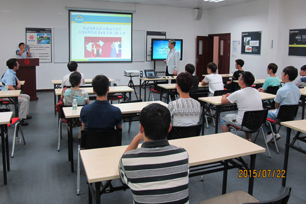 7月15日至24日期间,韩国韩南大学首次选派机械工学系现任系主任Hwang Chel Lho教授和前任系主任Sim Woo Gun教授来我校,面向中韩合作机械设计制造及其自动化专业学生,教授《动力学》和《流体力学》两门专业课程。为提高教学效果,机械工程学院还将正在韩国汉阳大学攻读机械工程硕士学位的焦流和韩南大学机械工学系三年级学生凡朋林两位优秀留学生校友,召回凤阳担任此次外教授课的助教。