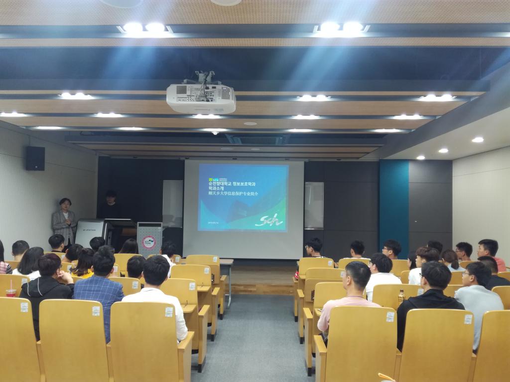 5月14日,同学们在顺天乡大学国际教育交流处的安排下,走进了顺天乡大学信息保护专业课堂,和韩国大学生及蒙古籍留学生一起聆听柳壹善教授讲授专业课程,第一次面对纯韩语的教学环境和开放式讨论教学方式。之后同学们聆听了顺天乡大学信息保护专业研究生和博士生对专业研究方向和六个研究室的师资和研究内容情况的介绍,使同学们对未来所学专业方向选择有了初步的了解和认识。