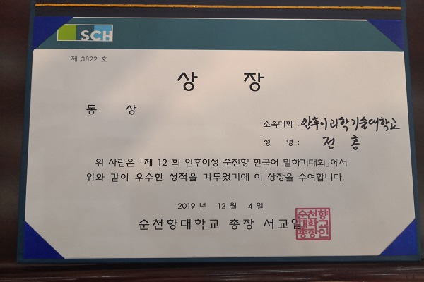 顺天乡杯韩语演讲大赛包括开幕式、演讲比赛和颁奖仪式三部分,期间穿插数次抽奖竞答活动。赛程中各位选手尽展其能,各领风骚。安科代表团队三位选手沉着冷静,发挥出色,他们优异的表现得到了评委们的一致认可,斩获银奖、铜奖各一项,为我校历年参赛最佳成绩。选手们用自己的辛勤和努力,用自己的热爱和坚持,为安科赢得了荣誉,展示了安科学子风采。