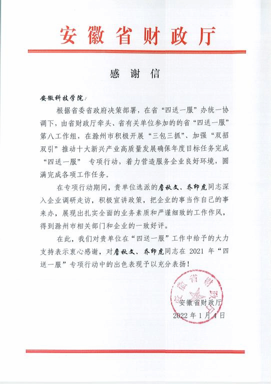 近日,由安徽省财政厅牵头的省“四送一服”第八工作组给我校发来感谢信,对我校在“四送一服”工作中给予的大力支持表示感谢,对詹秋文、乔印虎两位同志在2021年度省“四送一服”专项行动中的出色表现予以表扬。来信指出两位同志深入企业调研走访,积极宣讲政策,把企业的事当作自己的事来办,展现出扎实全面的业务素质和严谨细致的工作作风,得到滁州市相关部门和企业的一致好评。