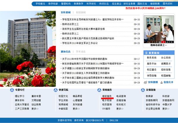 为认真践行学校正在开展的“三严三实”专题教育及“三个专项行动”工作部署,更好地为广大师生员工服务,根据学校领导指示精神,经协调,我处于近期在校园网主页“常用服务”栏目下增设“维修服务”窗口,以方便全校师生及时申报维修项目。